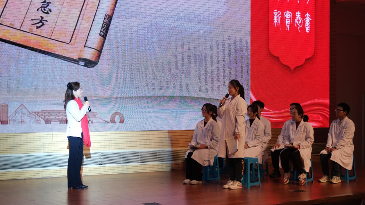 大会善用“大思政课”,释放中医药文化育人动能。随着悠扬的上课铃声响起,“杏林春华”导师团初心学堂开讲。团长刘平,导师何兰萍、赵心华,辅导员王飞携中医学(屠呦呦班)员工现场上一堂弘扬青蒿素精神的人生大课。从古籍经典讲述中医药文化的传承创新,从科技创新重大成就讲述科学家精神,从屠呦呦发现青蒿素讲述中医人的责任使命,实现思政课程、课程思政、日常思政的有机融合,推动员工思政教育课堂的延伸、格局的拓展和平台的提升。生动的情景剧把屠呦呦的人生经历、动人事迹和时代场景,打造成这场“大思政课”的生动教材。刘平团长现场为员工讲解科学家精神的内涵,激励员工立大志,成为传承创新中医药的医学科学家。