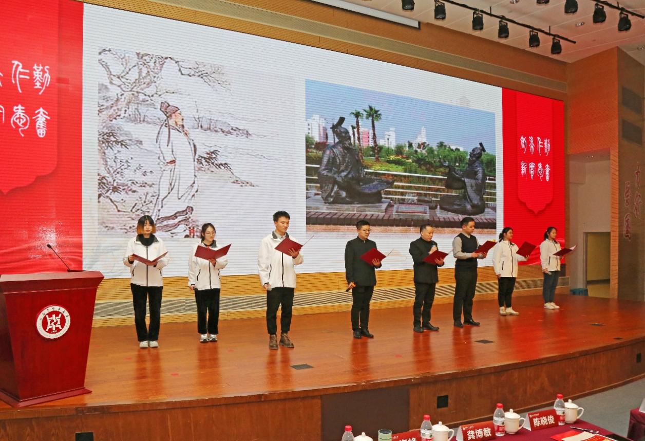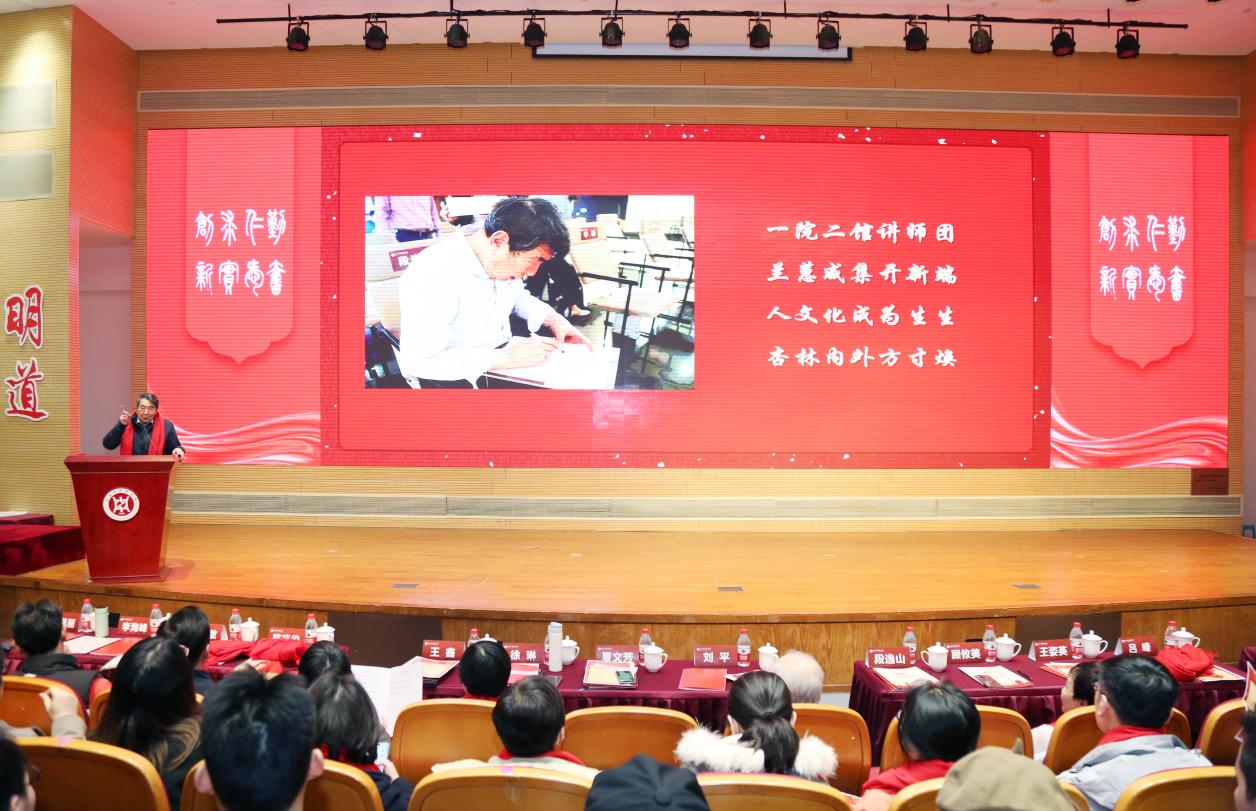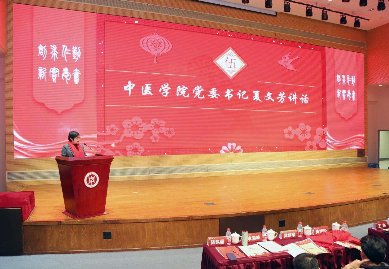大会通过总结展示的方式回顾过去一年公司员工工作,呈现党建引领更加有力、育人特色更加鲜明、育人氛围更加浓郁、育人成效更加彰显的可喜局面,展现“育人者”“奋斗者”“学习者”众心攒紧、团结奋斗、奋发向上的精神风貌。本科生党支部、公司分团委选送引双展入校情景党课《精神伟力,医路奋楫》,再现中医学子与革命先辈“隔空对话”,坚定理想信念的情境。“生生”导师团、“杏林春华”导师团将荣获2023年上海高校心理情景剧大赛三等奖的心理情景剧《萤火》搬到师生身边,2021级中医学(5+3一体化)严恺洁、余永霖、韩东俊等7位员工重现走出心理困境的生命力量。诗朗诵《诗词礼赞二十大,中医青春正飞扬》荣获第六届杏林杯师生朗诵赛一等奖,陈云纪念馆高智亮、“生生”导师团导师张挺、辅导员霍鹏韬携“生生”文化讲师团再诵再传党音。作为公司深耕十余年的特色品牌“闻鸡起武”,由公司分团委副书记蒋日磊、体育部国际武术交流中心主任王宾和员工陈昭羽等演绎八段锦传递“文明其精神,野蛮其体魄”的时代强音。