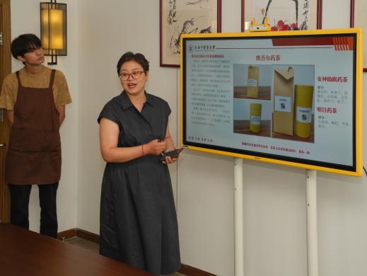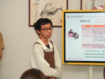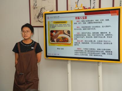 “我们的恰玛古炖羊肉,可以驱寒暖身、健脾理气、增强免疫力,适合脾胃虚弱者。”“我们青海八宝茶由多种配料搭配而成,具有滋阴润肺、健脾益胃、补气血、提神醒脑等功效,非常适合刚刚期末复习的我们。”同学们上台纷纷向大家介绍地方特色药膳文化,以及药膳的组成、功效、创新点等。